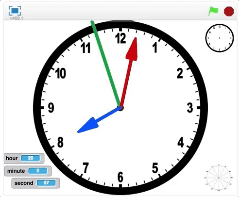 Ideas: Remix to create a more realistic looking analogue clock in Scratch. This one is still has a bunch of things not working right… Want to remix it and make it look more realistic? Or, make your own analogue clock from scratch.