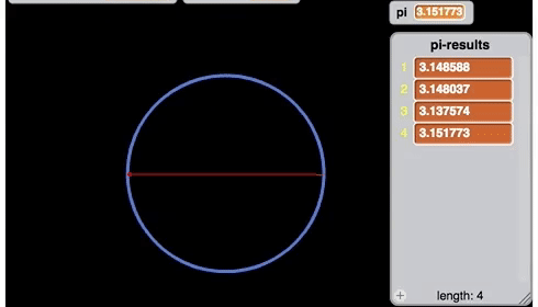 Project: https://scratch.mit.edu/projects/128253091/ Ideas: Think about discuss why you think the mean value of π never seems to get close to the expected value of 3.141593. Remix
